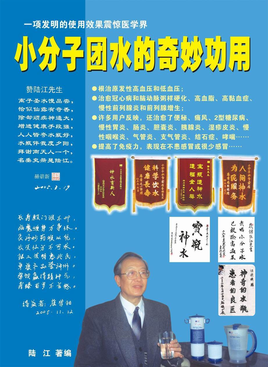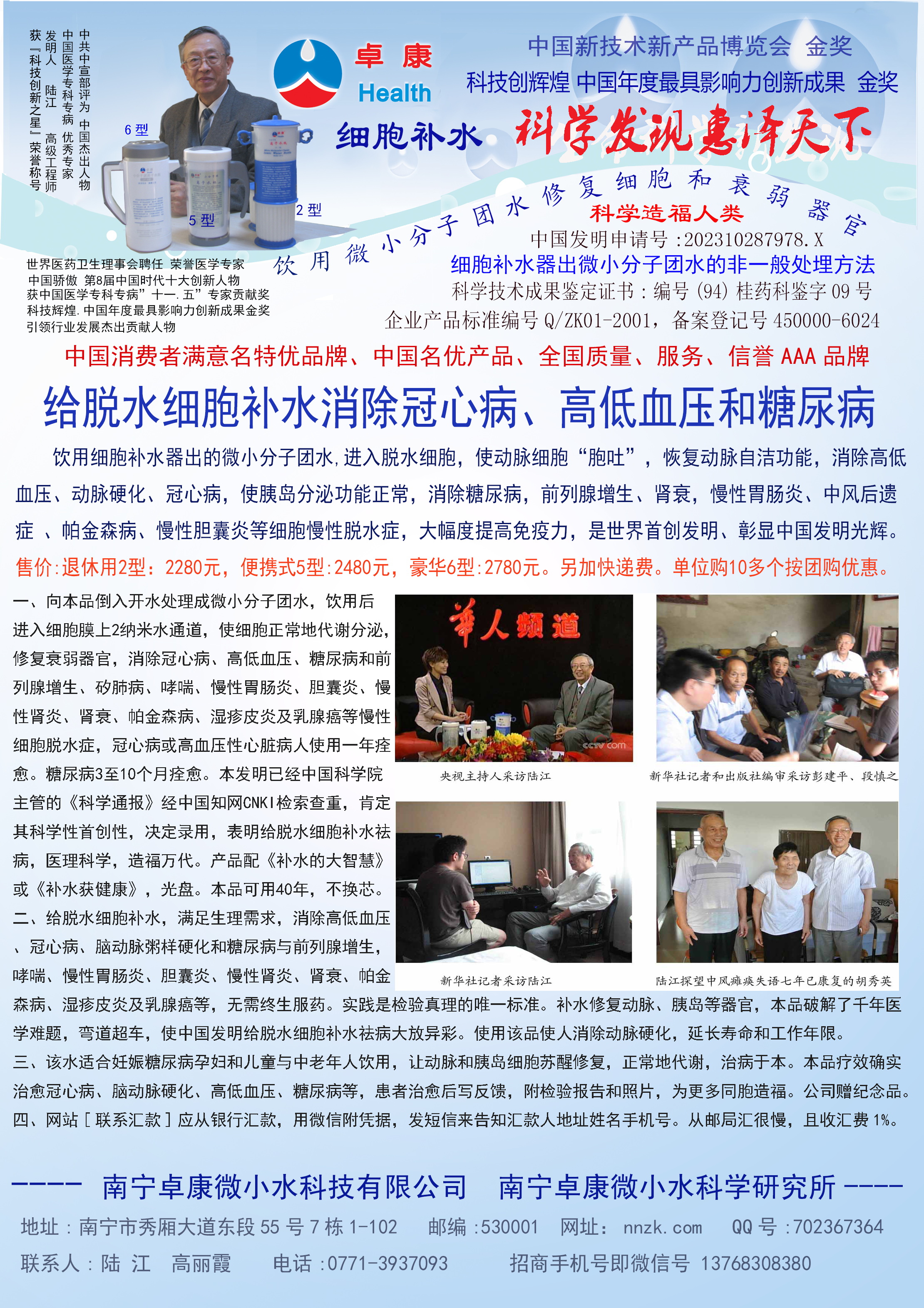 人類幾千年來患以上病癥需終生服藥,幾十年也不能治愈。可是我國南寧的高級工程師陸 江,于1990年想根治高血壓,研究發(fā)明了離子水瓶,處理出微小分子團水供飲用,經(jīng)過醫(yī)院臨床試用和專家鑒定,1999年獲中國發(fā)明專利權(quán),產(chǎn)品于2000年投放市場后一直跟蹤調(diào)查,據(jù)全國各地用戶反饋:祛除了高低血壓、糖尿病和冠心病,并使前列腺增生、咽喉炎、鼻竇炎、慢性氣管炎、支氣管炎、矽肺病、哮喘、慢性胃炎、腸炎、慢性膽囊炎、慢性腎炎、腎衰、膀胱炎、便秘、痔瘡、風濕性關節(jié)炎和濕疹皮炎及中風后遺癥等病癥不藥而愈。為什么喝微小水能治20多種病?陸 江從1991年德國科學家發(fā)現(xiàn)細胞膜水通道僅為2納米獲得啟發(fā),認為多種器官患病是因細胞脫水,不能正常代謝和分裂增殖,才使器官細胞減少致衰弱萎縮而形成細胞缺水性病癥。22年來的實踐有力地支持了“細胞脫水致病”這一重要論點,表明喝微小水可滿足細胞的生理需求,補水就能祛病,是生命科學新亮點。