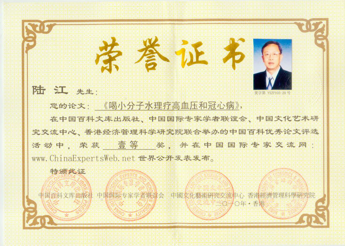 -----我是從事建筑的高工,本來沒有資格去攻克醫(yī)學難題,卻為了自身健康才扣響醫(yī)學的大門。由于我1990年患高血壓,因怕中風才研究發(fā)明了離子水瓶,我把水處理成微小分子團水,飲用后治愈了高血壓。便于1993年底送到三家省級醫(yī)院做臨床試用4個月。經(jīng)北京和廣西醫(yī)學專家鑒定:"降脂降壓效果好"," 能擴大心腦動脈流量,改善心腦電圖以及微循環(huán)","對治療心腦動脈粥樣硬化、高血壓、高血脂有良好的醫(yī)療保健作用。""產(chǎn)品的技術(shù)性能和療效達到了同類產(chǎn)品的國內(nèi)領先水平,經(jīng)廣西醫(yī)學科學情報研究所檢索,未見國外有類似報道。"中國醫(yī)學科學院張正國教授從美國國立醫(yī)學圖書館數(shù)據(jù)庫存Medline檢索英俄文資料,均未見類似報告。2000年上市后,我為了對消費者負責而繼續(xù)觀察研究,一直通過《信譽卡》和《質(zhì)量跟蹤調(diào)查書》向患者承諾療效,請用戶使用6個月后反饋效果。和脂壓患者飲用2至5個月內(nèi),消除癥狀,停服藥物,血壓正常;冠心病患者飲用3~5個月逐漸減輕至消除心絞痛、房顫等癥狀,不再服藥,飲用1年左右心電圖正常,經(jīng)冠脈造影掃描無明顯狹窄,表明冠心病痊愈。大量患者還反映許多衰弱器官被修復,讓前列腺增生、慢性咽喉炎、慢性氣管炎、支氣管炎、慢性胃炎、腸炎和膽囊炎等不藥而愈;2型糖尿病患者是因為胰島衰弱致病,飲用該水半年至一年,逐漸減藥至停藥,血糖尿糖正常,真正治愈2型糖尿病。中風后遺癥患者飲用六七個月,可逐漸減輕至消除肢體和語言障礙,表明飲用該水能讓壽命很長的神經(jīng)元細胞逐漸修復,奇跡般地恢復肢體和語言功能。飲用后還使胸腺和脾臟兩個重要的免疫器官被修復和增強,產(chǎn)生免疫細胞多,提高了免疫力,使人不生病或少生病。自此, 飲用微小分子團水創(chuàng)造了攻克冠心病、高(低)血壓和糖尿病三大醫(yī)學難題的奇跡。人們對此感到不可思議,但實踐是檢驗真理的唯一標準。